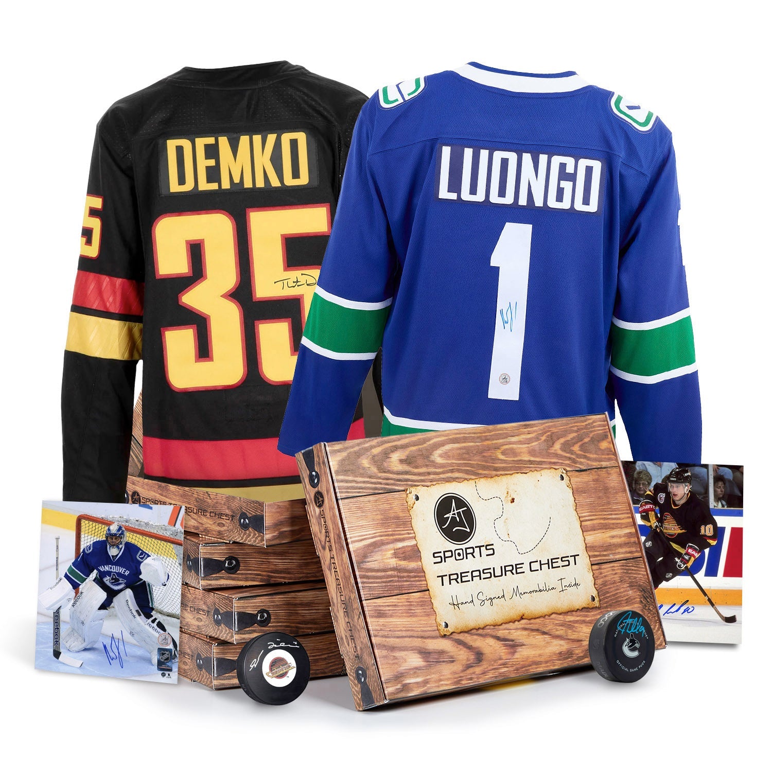 • Each sealed Vancouver Hockey Hat Trick Treasure Chest contains an autographed hockey jersey, autograph puck and autographed 8x10 photo.