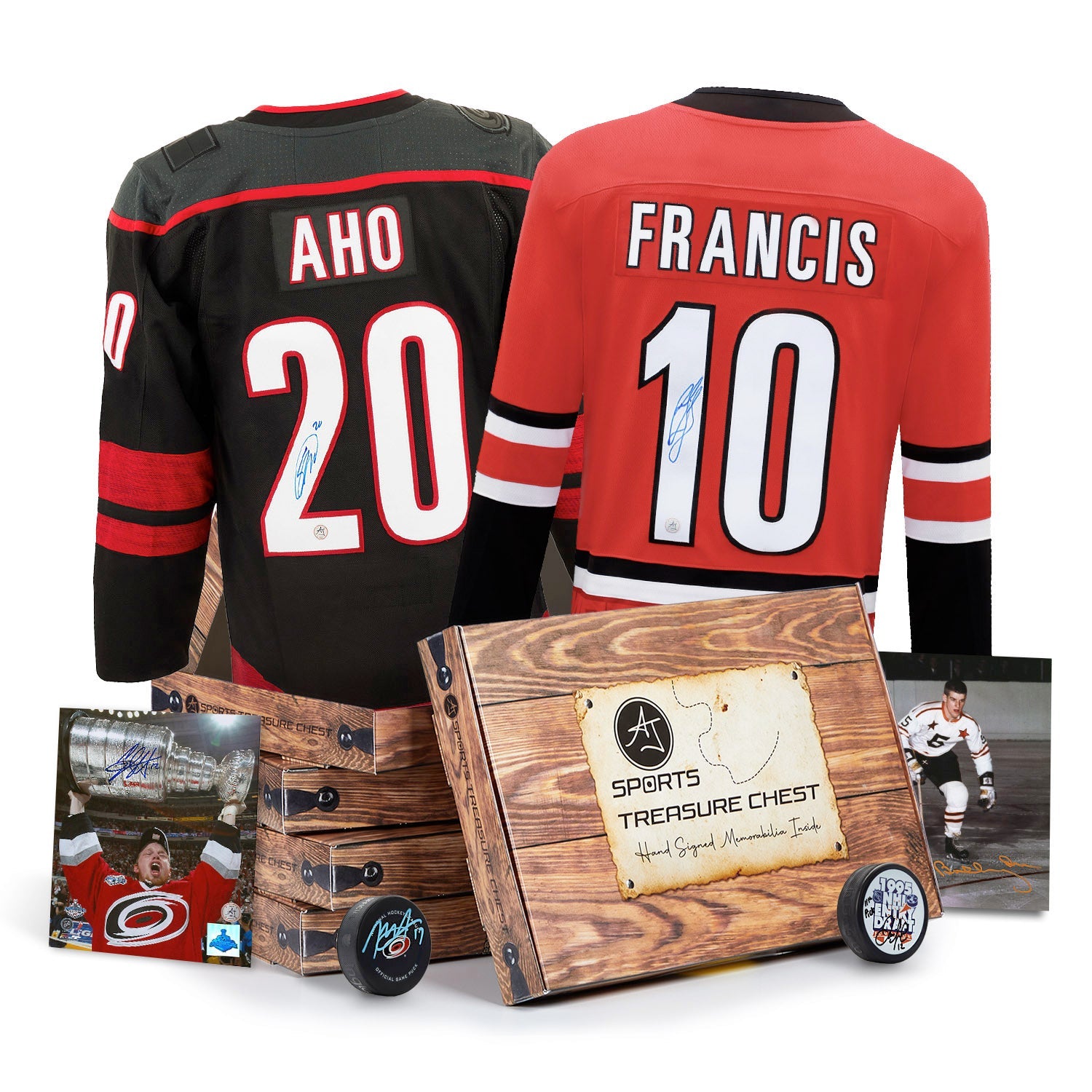 This series features unique autographs from a variety of hockey players, stars and legends. Please note this is a mystery product and there is no guarantee of any specific advertised treasure in any individual chest. Each chest contains randomly inserted memorabilia from the series. Each Treasure Chest is packed, sealed and mixed at our headquarters. There are no returns, refunds or exchanges on Treasure Chest products. AJ Sports offers a 60 day warranty on any product defects.